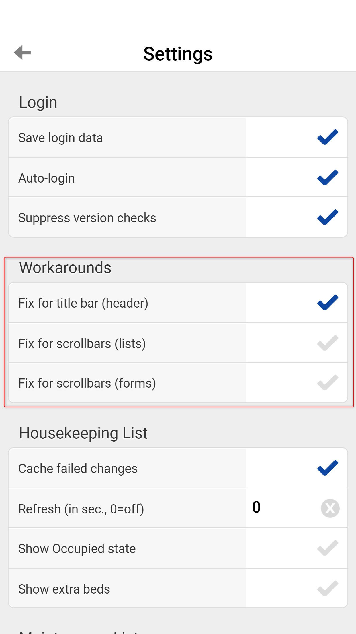 Using the settings "Workaround", you can "fix" the title bar and scroll bars in lists and forms as needed. For some users it may happen that the title bars or scroll bars are "swallowed" due to view errors. If this happens to you frequently, you can use these settings to anticipate the problem.
